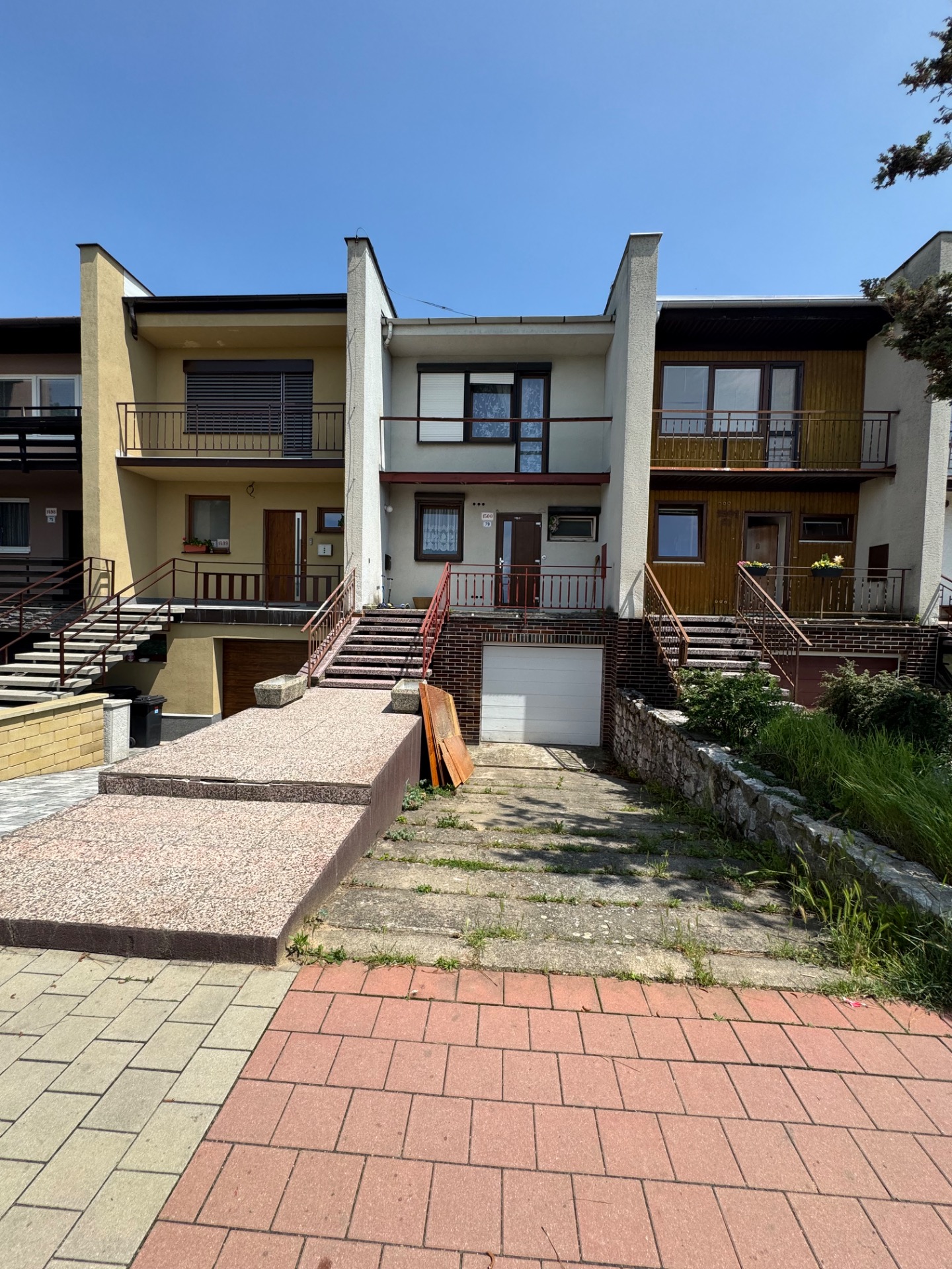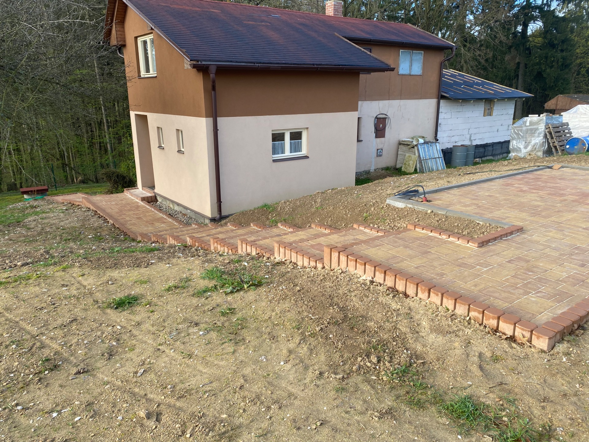 Ve velmi svažitém a kamenitém terénu se budoval chodník s pozvolnými schody pro starší pár s dřevěnou pergolou do 25m2.